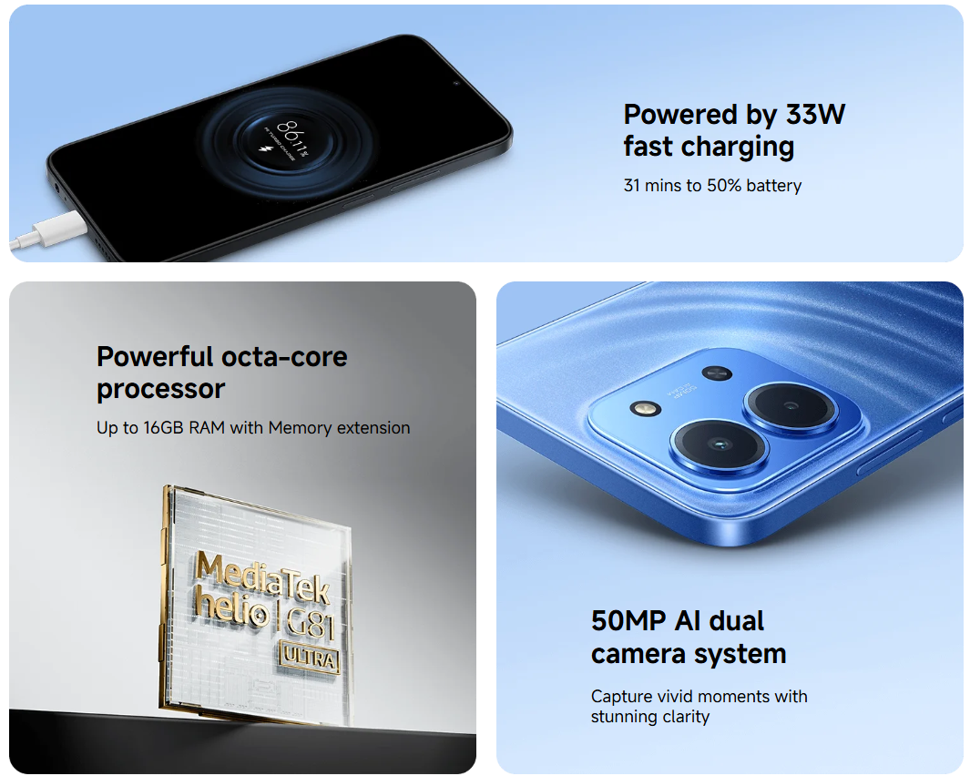 ريدمي 15C – رام 6 جيجابايت، مساحة تخزين 128 جيجابايت – شريحتين اتصال، دعم 4G LTE (أزرق فاتح)